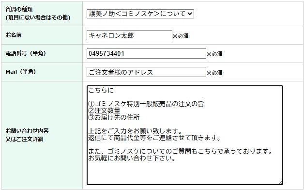 ご注文はお問い合わせフォームにて質問の種類より